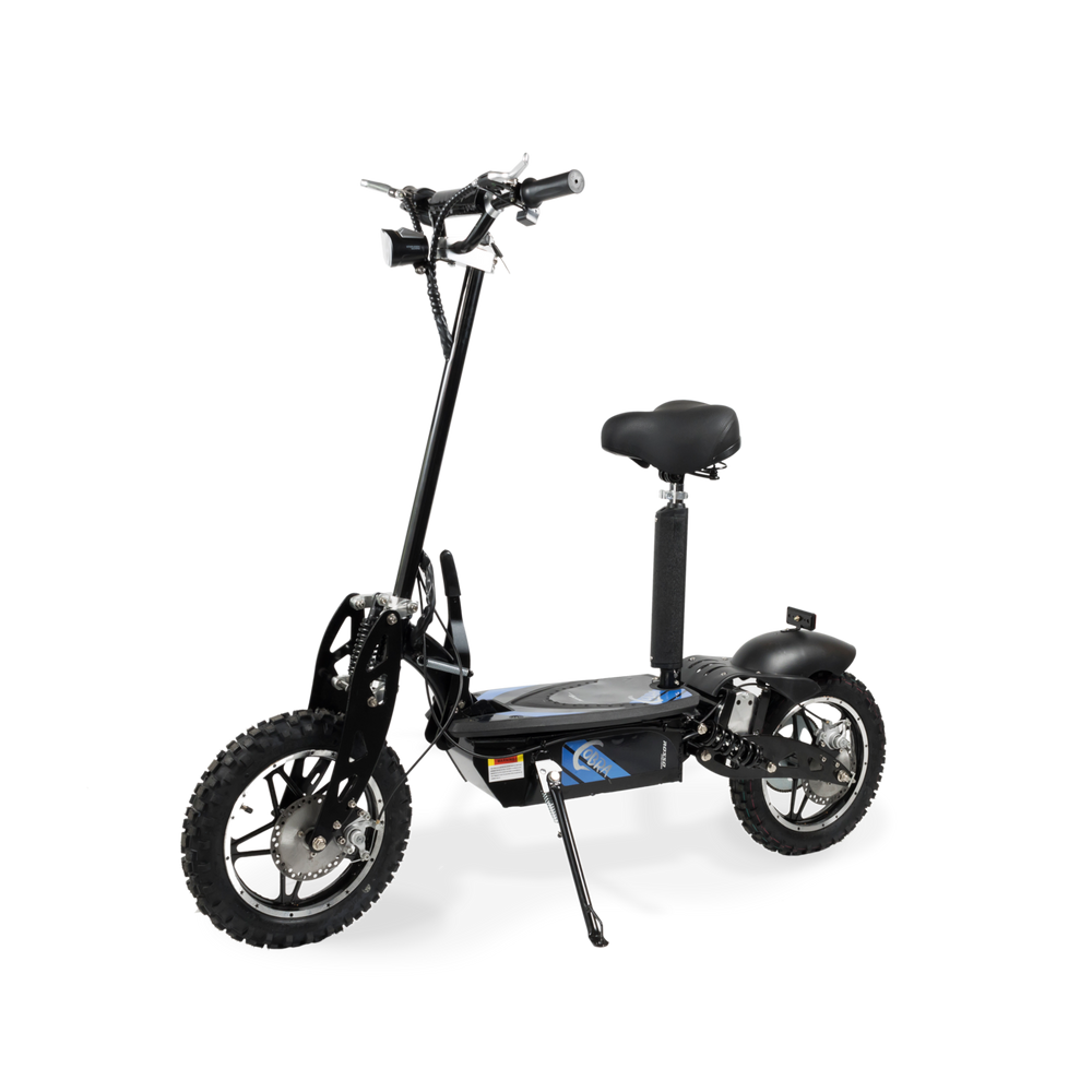 Powered with the 36V battery and 1000W motor, the Cobra kick scooter can be ridden through mud, rain, bumpy roads, and uphill.